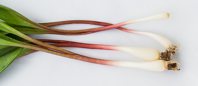 Ramps are perennial wild leeks that have small, white bulbs; smooth, broad, and light green leaves; purple- or burgundy-tinted stems; and hairy roots. They look like green onions but taste garlicky. The green leaves and the white lower stalks can be eaten. According to magazine foodwriter Josh Ozwersky, “The Church of the Ramp is the one of the fastest-growing denominations in the religion of seasonality.”
