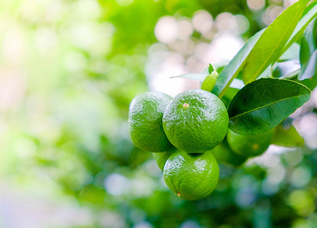 Key limes (Citrus x aurantiifolia) are oval citrus hybrids native to Southeast Asia. The name of this fruit is taken