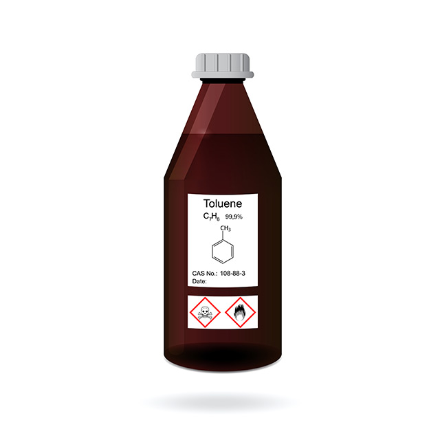 Toluene, also known as toluol, a colorless, water-insoluble liquid distinguished by its strong odor, which can range from pungent to